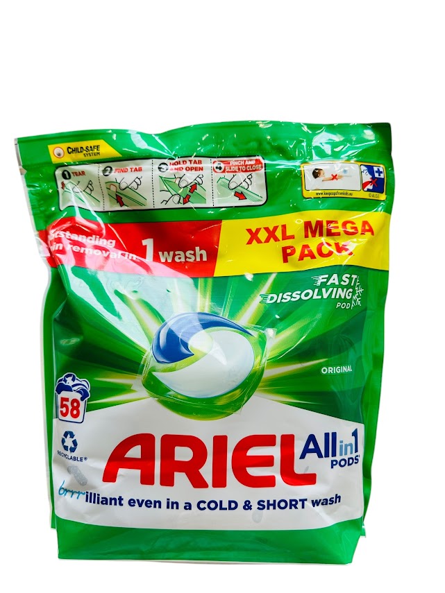 👉 Kies voor Ariel Allin1 Pods Original 58SC en geniet was na was van een onberispelijk schone, frisse en verzorgde garderobe.