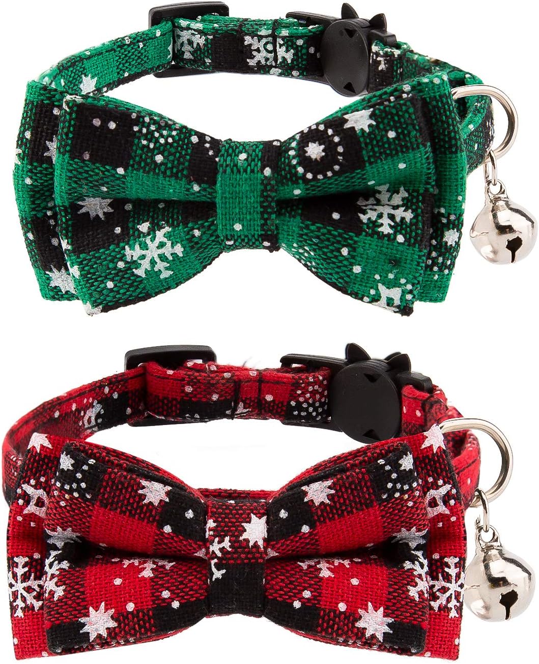 Geef je huisdier een feestelijke look met deze set van 2 kerstkattenhalsbanden met klassieke rode en groene ruitmotieven. Elke halsband is voorzien van een afneembare strik en een klein belletje, zodat je kat of pup er niet alleen stijlvol uitziet, maar ook makkelijk te vinden is.